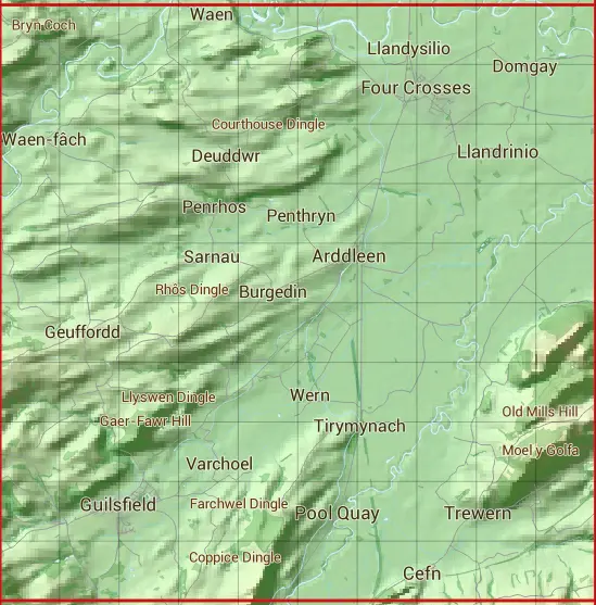 The SJ21 10 square kilometre grid intersects with the settlements of Arddleen,Cefn,Cegidfa,Criggion,Four Crosses,Geuffordd,Llandrinio,Llandysilio,Middletown,Penthryn,Pool Quay,Rhos,Trewern,Varchoel,Waen & Wern.